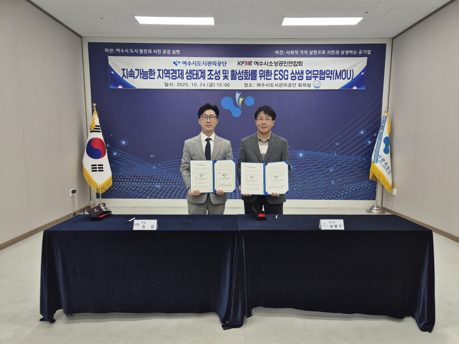 여수시도시관리공단(이사장 송병구)과 여수시소상공인연합회(회장 김겸)는 2025년 10월 24일, 지역경제 회복과 ESG(환경·사회·지배구조) 기반 공급망 구축을 위한 업무협약(MOU)을 체결했다고 밝혔다.