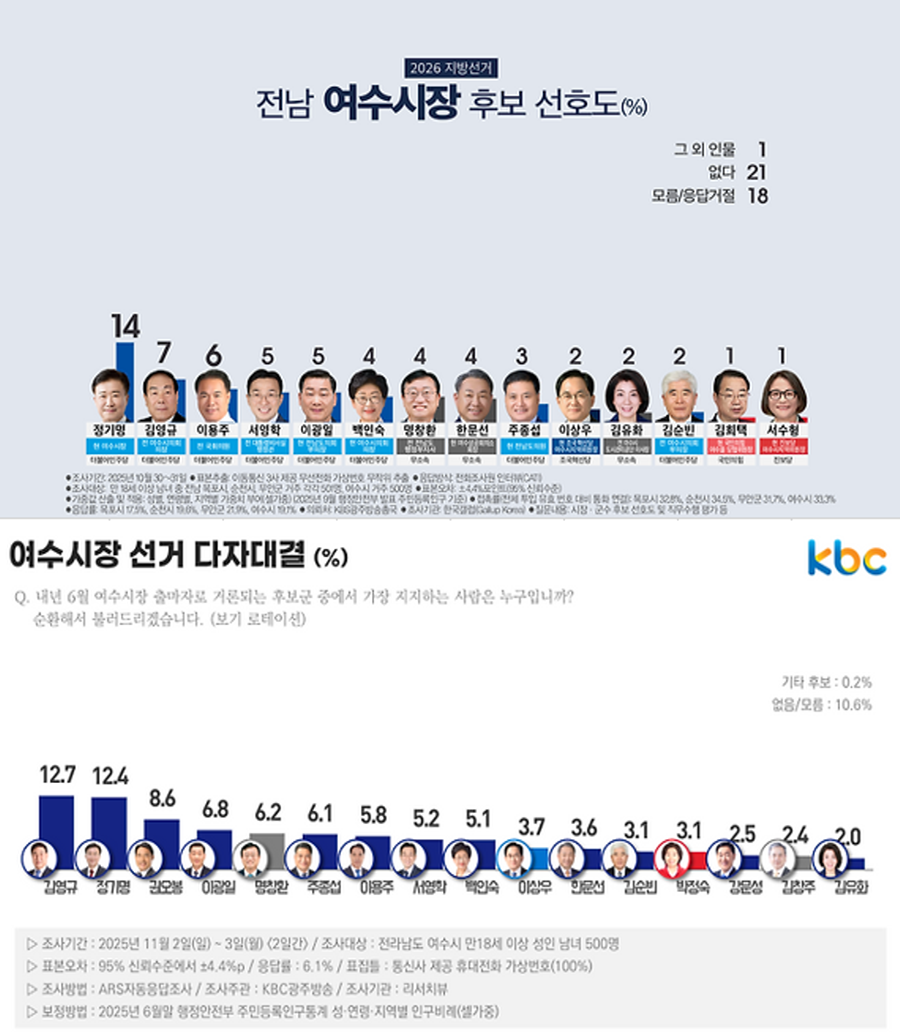 KBS 조사(10월 30~31일, 한국갤럽 의뢰)에서도 정 시장 14%, 김 의원 7%, 이용주 전 의원 6%, KBC 조사(11월 2~3일, 리서치뷰 의뢰)에서는 김영규 의원 12.7%, 정기명 시장 12.4%로 사실상 동률로 비슷한 구도를 보였다.
