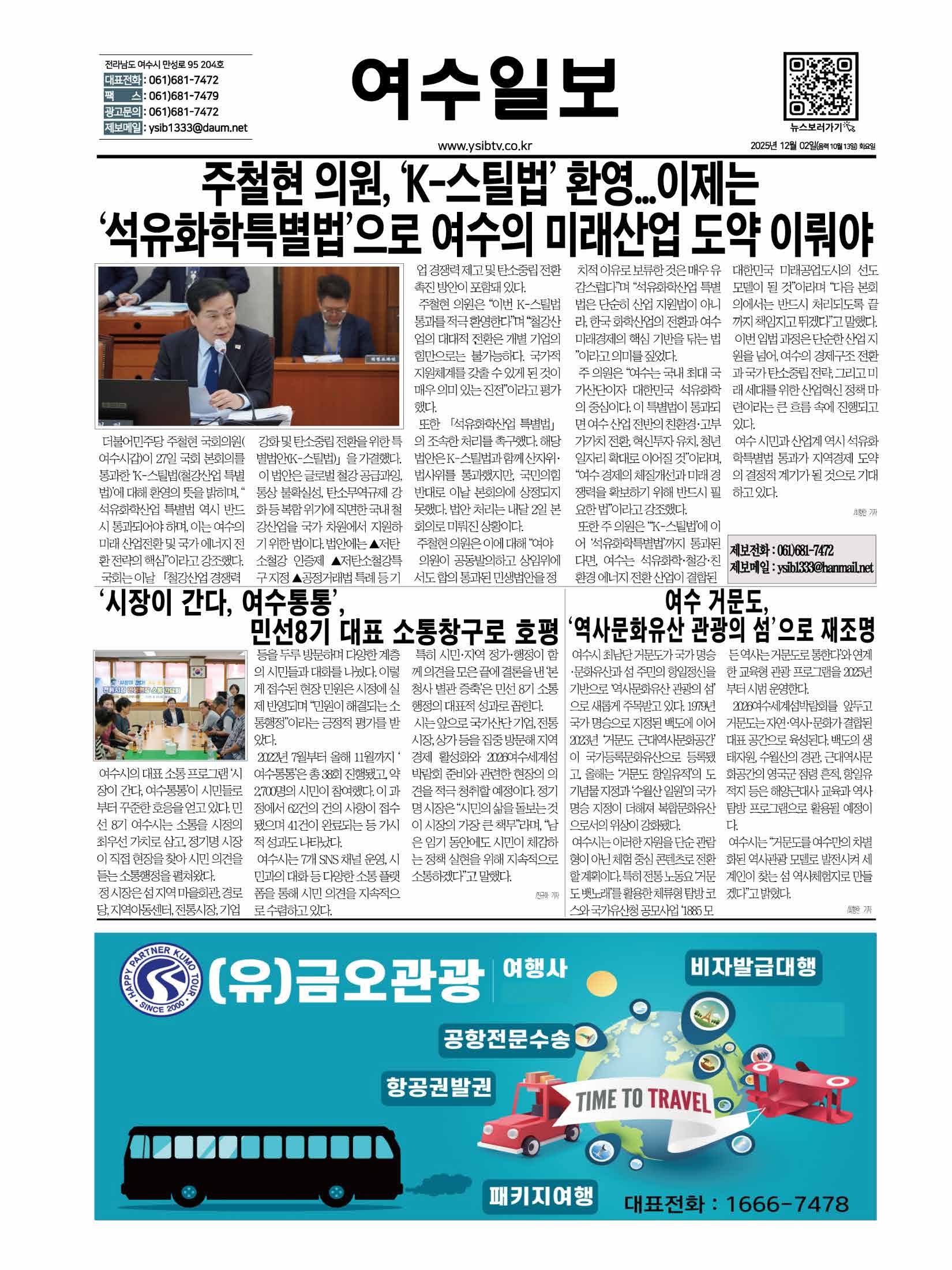 더불어민주당 주철현 국회의원(여수시갑)이 27일 국회 본회의를 통과한 ‘K-스틸법(철강산업 특별법)’에 대해 환영의 뜻을 밝히며, “석유화학산업 특별법 역시 반드시 통과되어야 하며, 이는 여수의 미래 산업전환 및 국가 에너지 전환 전략의 핵심”이라고 강조했다.