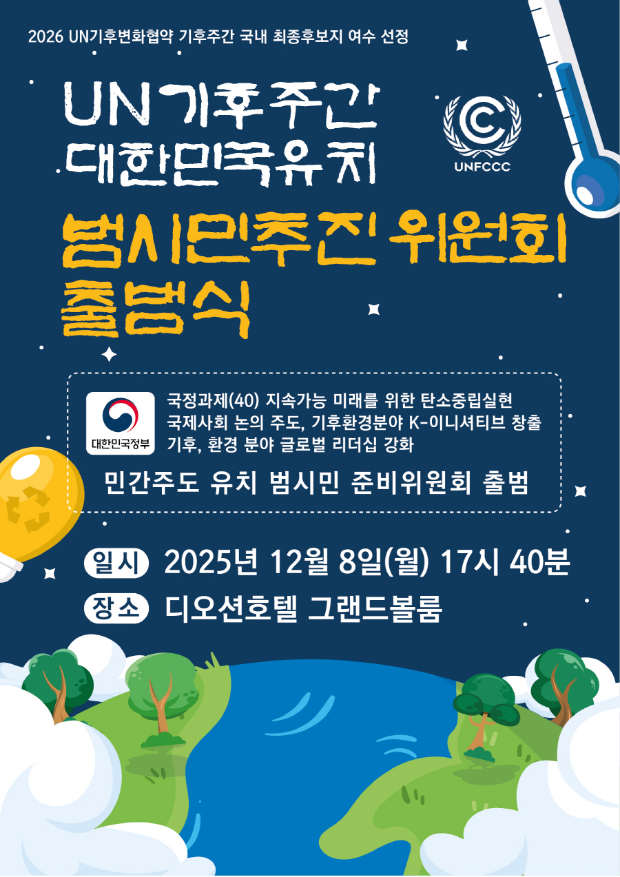 UN기후변화협약(UNFCCC) 2026 기후주간(Climate Week) 대한민국 유치를 위한 범시민준비위원회가 12월 8일 디오션호텔에서 공식 출범한다.