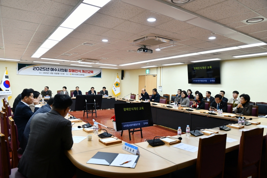 여수시의회(의장 백인숙)는 지난 12월 15일 오후 1시 시의회 소회의실에서 전체 의원과 의회사무국 직원을 대상으로 「2025년 장애인식개선교육」을 실시했다.이번 교육은 의회 구성원들이 장애