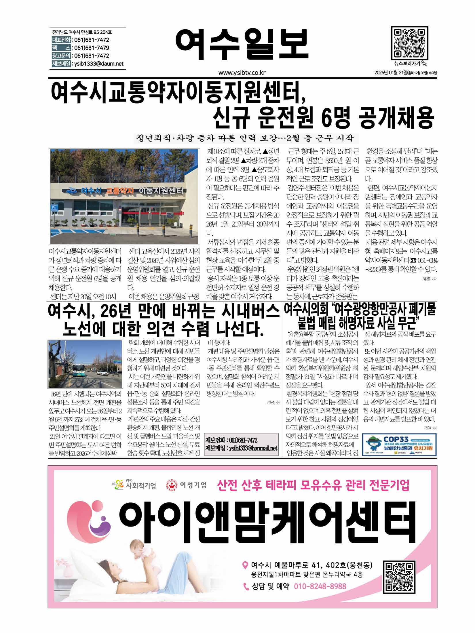 | 여수시교통약자이동지원센터, 신규 운전원 6명 공개채용 (0) | 2026.01.21 |
