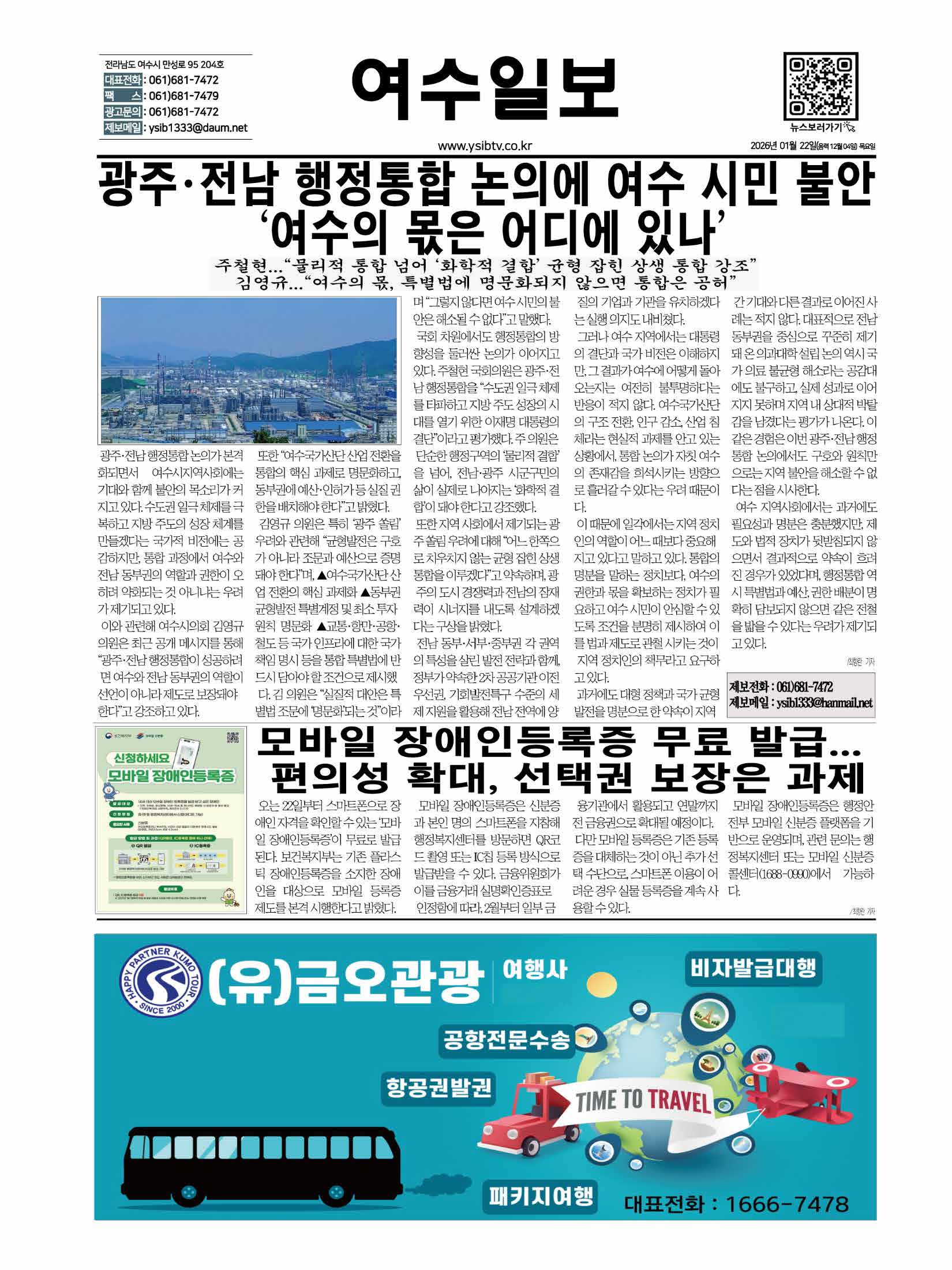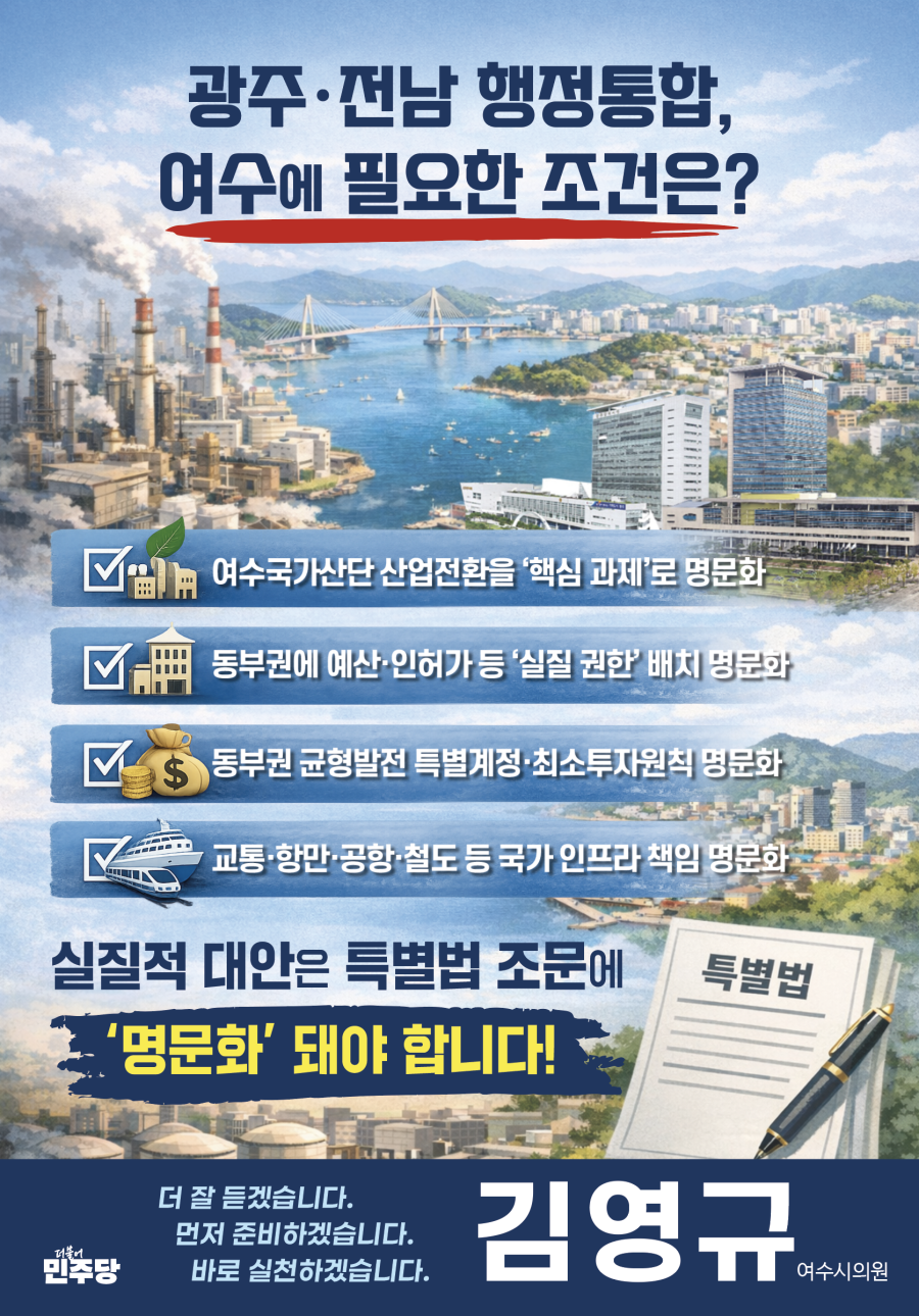 이와 관련해 여수시의회 김영규 의원은 최근 공개 메시지를 통해 “광주·전남 행정통합이 성공하려면 여수와 전남 동부권의 역할이 선언이 아니라 제도로 보장돼야 한다”고 강조하고 있다.