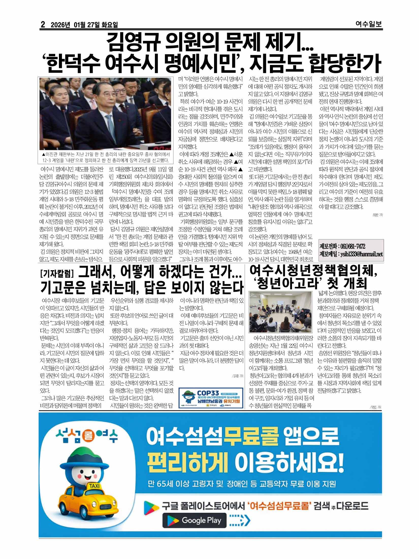 | 여수시, 체감행정 실현 위해 ‘시정 견문보고제’ 본격 추진 (0) | 2026.01.27 |