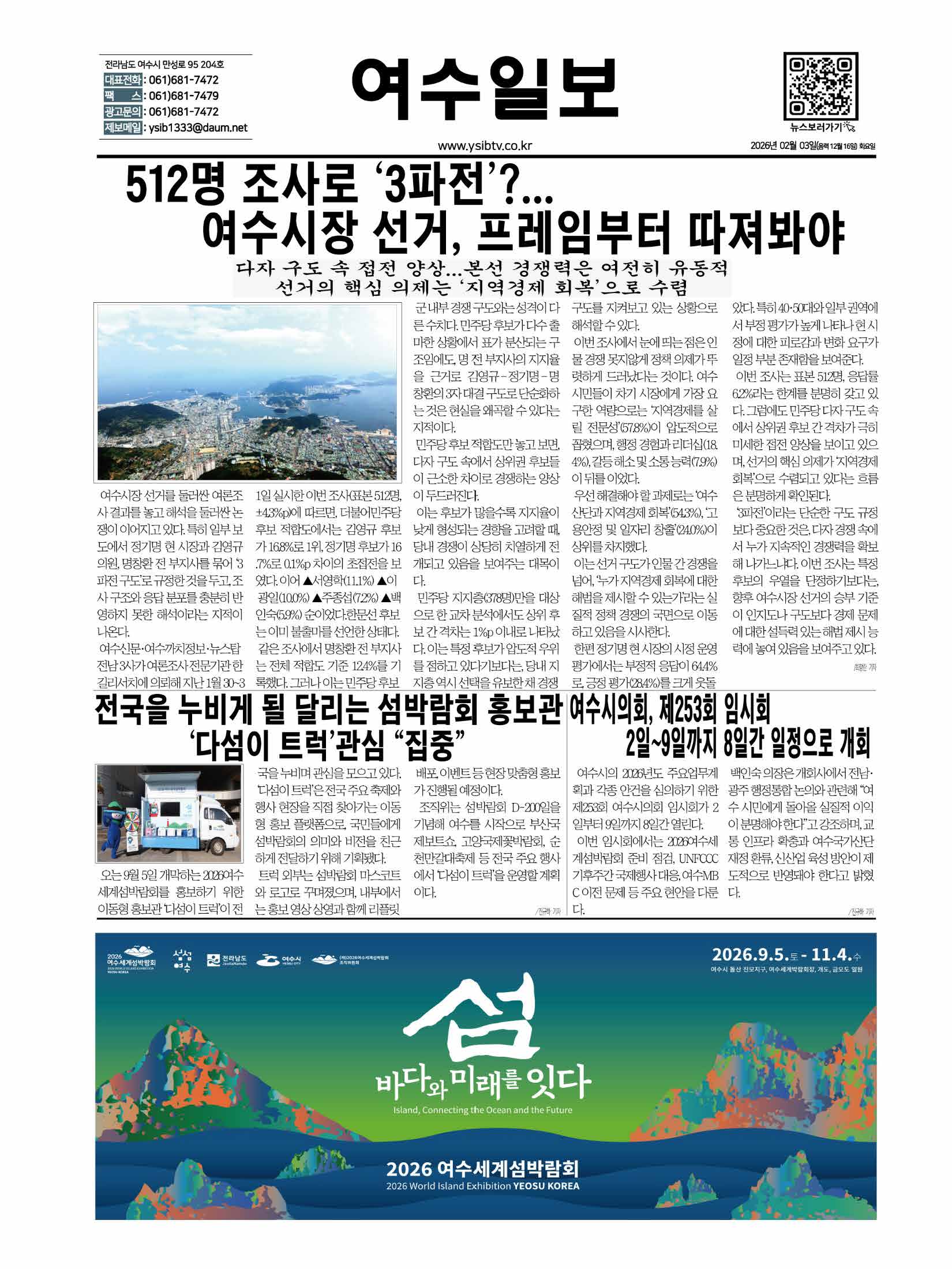 | 512명 조사로 ‘3파전’?…여수시장 선거, 프레임부터 따져봐야 (0) | 2026.02.03 |