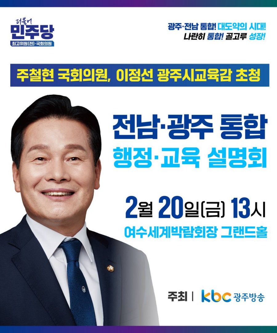 더불어민주당 최고위원(전 국회의원)인 주철현 의원은 오는 2월 20일 오후 1시, 여수세계박람회장 그랜드홀에서 ‘전남·광주 통합 행정·교육 설명회’를 개최한다.